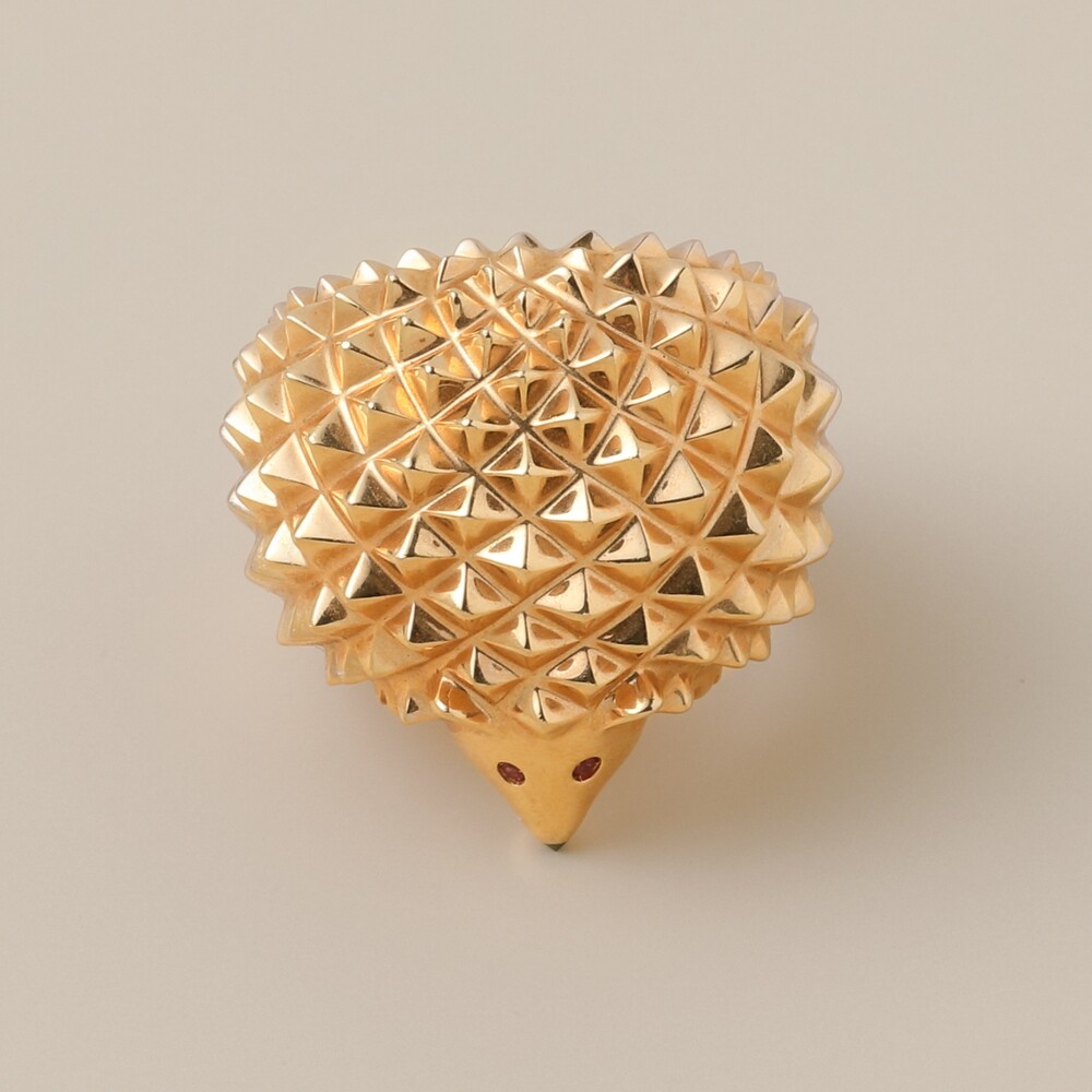 파리 방돔 광장에 최초로 부티크를 열었던 160년 넘는 역사를 가진 부쉐론은 1900년대 중반부터 동물에 대한 영감을 많이 받은 브랜드입니다 .1866년 워크숍을 오픈한 이래 주얼리에 자연을 불멸의 존재로 담아왔습니다. 부쉐론은 비밀스러운 공정을 통해 실제와 같은 묘사력을 갖춰 그 자체적인 기술력을 매번 갱신하고 있으며, 독특한 주얼리 컬렉션의 아카이브를 가진 유일무이한 브랜드입니다.  골드의 섬세한 공정으로 모양을 만드는 애니멀 컬렉션은 특히 핸드메이드의 시대에 가능했던 전유물이나 다름 없을 정도로 공예적 기술이 많이 필요한 제품입니다. 그런이유로 지금의 대량생산의 시대에는 더욱 부가가치가 높고, 희귀해질 수 밖에 없습니다. 고슴도치의 귀여운 발과 귀까지 묘사된 하이폴리시된 뾰족뾰족한 표면감은 볼드하고 멋스러운 전체적인 디자인을 갖추고 있습니다. 블랙다이아몬드의 단단함과 루비의 신비스러움은 화룡점정의 환상적인 디테일입니다.