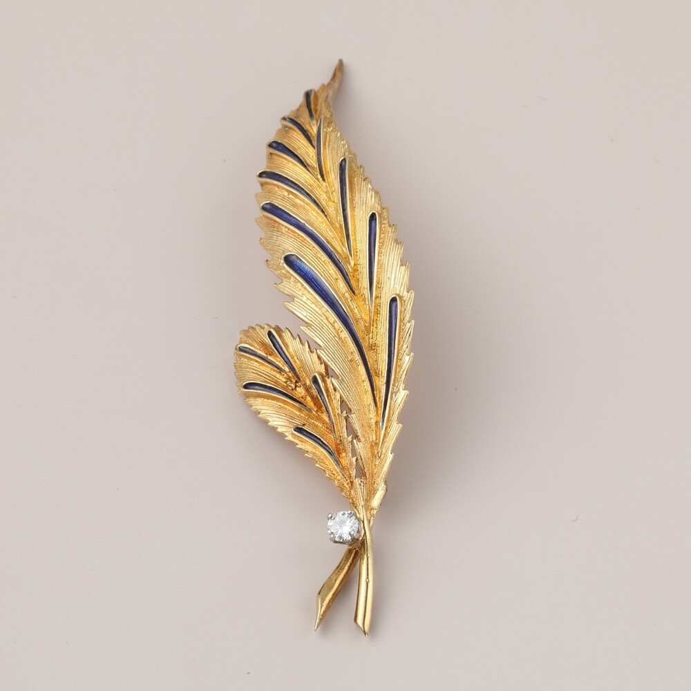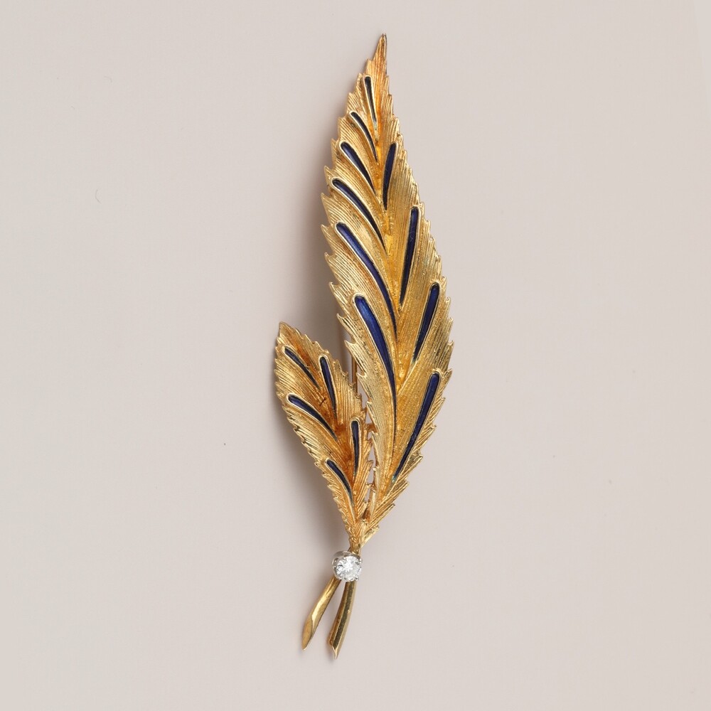 럼버제가 티파니사를 이끌었던, 5-70년대 특히 에나멜의 사용이 돋보이는 시대입니다. 러프한 잎의 질감 그대로를 살린, 자연을 그대로 묘사하는 티파니만의 전형적 스타일을 보여주는 멋있는 브로치에요.에나멜 기법은 칠보 기법 ( Cloisonné enamel ) 으로 좀 더 생동감있는 섬세한 디테일을 보여주고자 했어요. 아마 전체적으로 러프한 사실적 묘사를 하다보니 반짝이고 비비드한 주얼리다운 디테일이 꼭 필요하죠.러프한 질감을 보여주면서도 자연그대로의 곡선미는 절정입니다. 목선을 따라 사선방향으로 꽂으면 잎에 장식된 화려한 에나멜이, 세로 방향으로 길쭉하게 꽂으면 날카로울듯 시원하게 뻗은 곡선 디테일이 멋스러움을 보여주는 다채로운 스타일링이 가능하기도 하구요. 아름다운 곡선과 곡선이 만나는 그곳에는 다이아몬드의 반짝임이 하이라이트를 장식합니다.