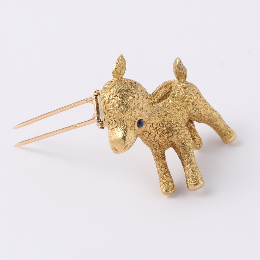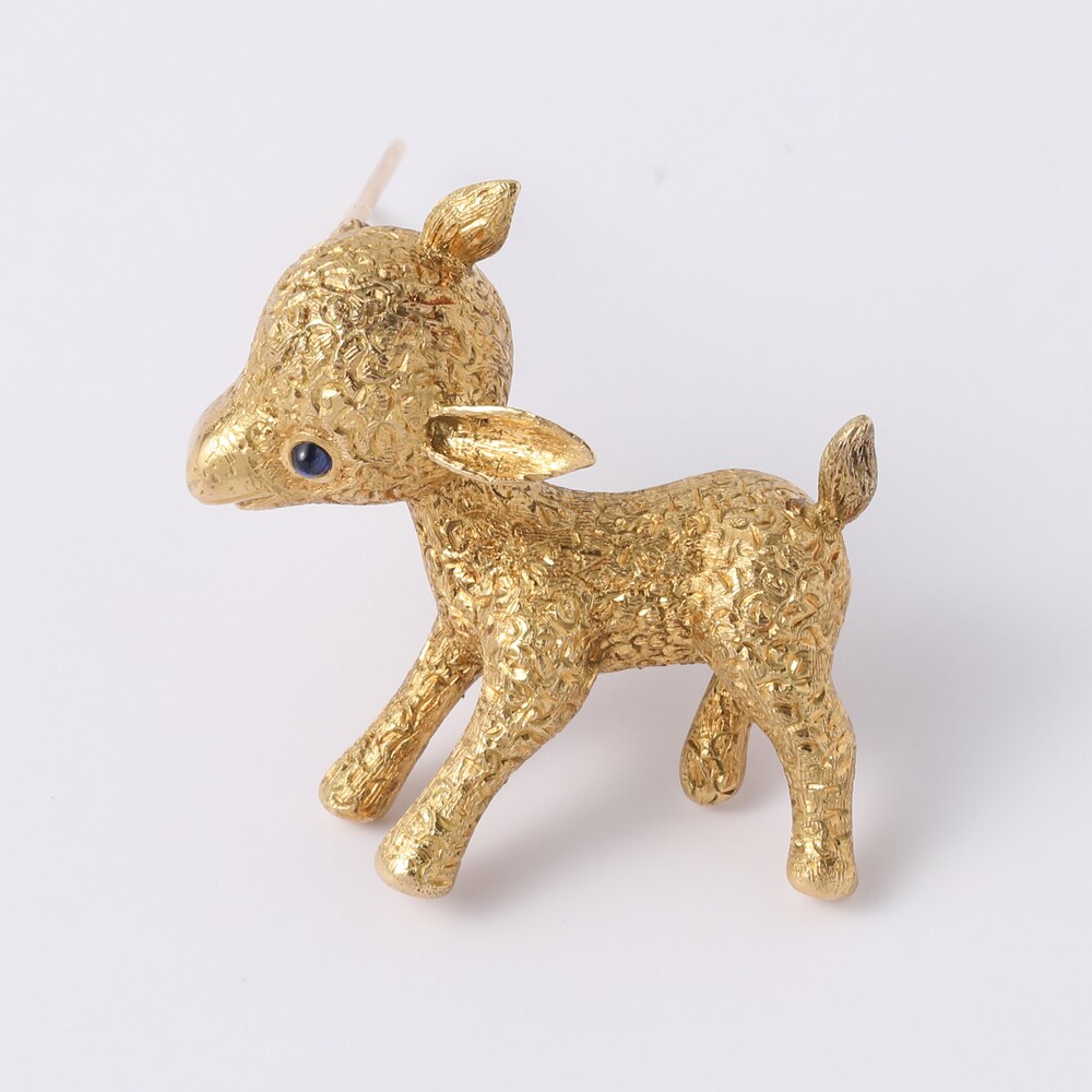 어린양(baby lamb)은 고대부터 순수함과 순결함을 상징하였고 특히 종교적인 의미로 순결한 제물이라던지, 희생을 상징하는 매우 성스러운 이미지입니다. 유독 어린양에게 특별한 구분을 하는 것은 외관에서 보여지는 큰 차이가 있기 때문인데요, 양모인 털도 유독 부드럽고 깨끗할뿐더러 어린양의 얼굴과 입, 귀엽게 솟은 귀와 작고짧은 다리등이 타동물에 비해 매우 부드럽고 앙증맞은 곡선들을 만들어냅니다. 1960년대 까르띠에는 자연그대로의 아기양 그려내는 것만으로도 동화의 한장면을 만들어낸듯 합니다. 굵지않은 작은 곡선들을 새겨 꼬불꼬불 피어나는 새로운 아기양의 털이 사랑스러울 따름입니다. 쫑긋 솟은 귀는 부드러운 곡선으로 매끄러운 얼굴에 발랄한 동작감을 부여하구요. 이처럼 순수한 얼굴과 몸에 가장 완벽한 카보숑 사파이어 눈이 더욱 반짝입니다.