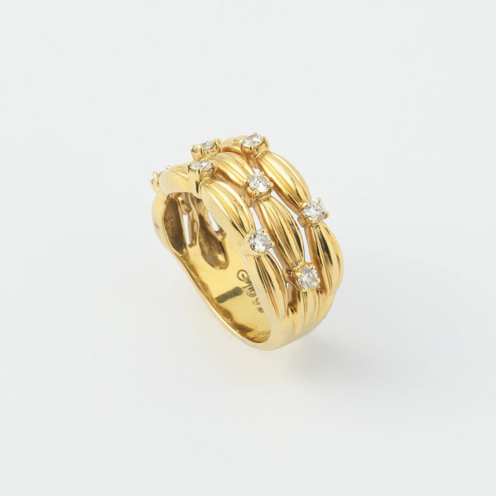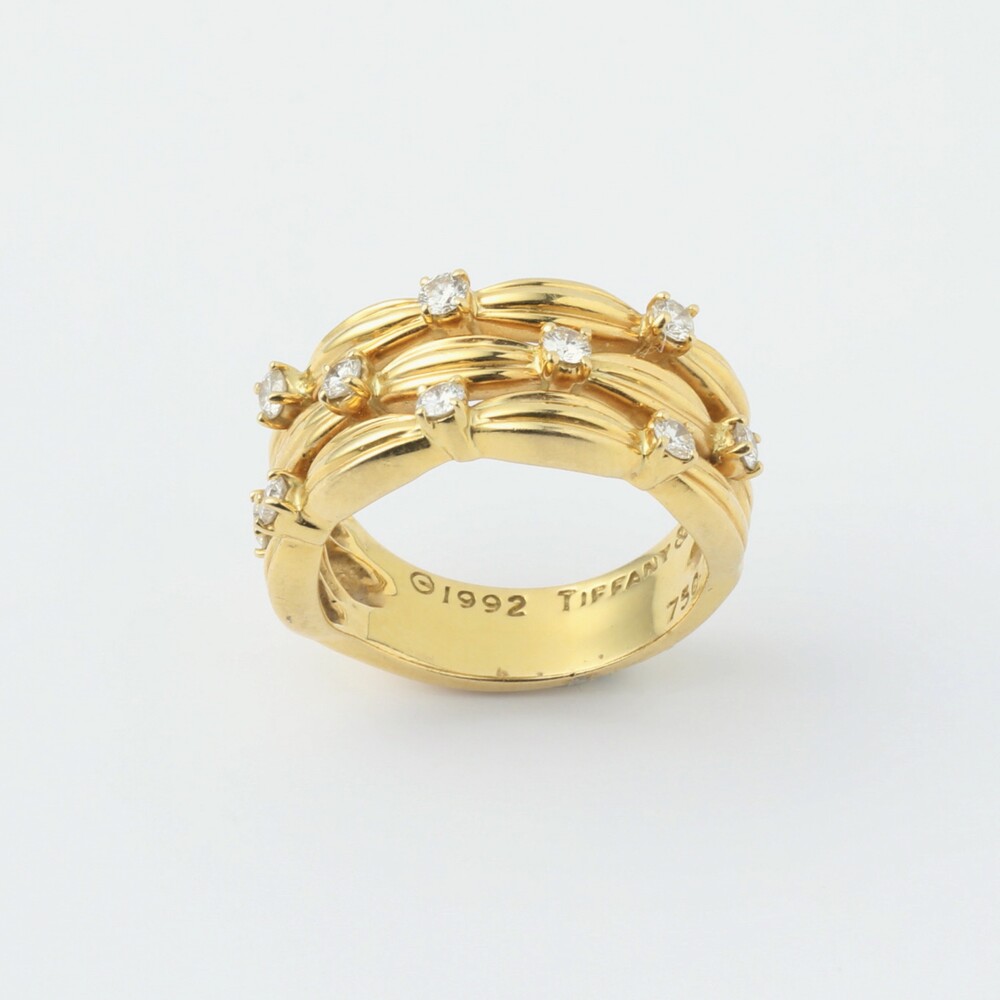 패브릭의 매듭 디테일을 표현한 90년대 티파니의 시그니처 컬렉션이었던 이번 제품은 매듭이 지어지며 약간의 구겨진듯한 주름이 생기는 패브릭의 풍성함과 질감을 효과적으로 나타내며 다이아몬드의 화려한 디테일까지 섬세하게 표현하였습니다. 화려하고 볼드한 주얼리가 유행했던 80-90년대의 트렌드에 매우 잘 맞는 볼륨감이 크고 화려한 레이어드 디자인으로 더욱 럭셔리하게 즐길 수 있는 컬렉션입니다. 티파니의 90년대 광고의 메인컬렉션이었던 매우 희귀하면서도 인기있는 이 제품은 다른 디자인의 링이나 팔찌와도 다양하게 믹스매치 할 수 있는 패션템이기도 합니다.